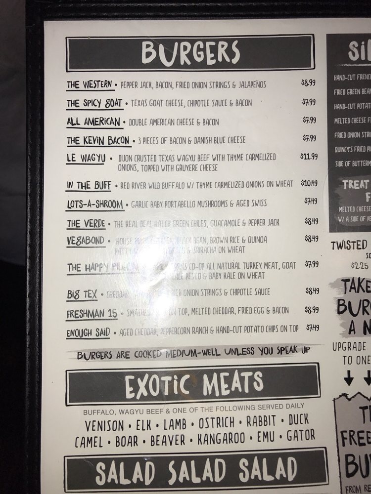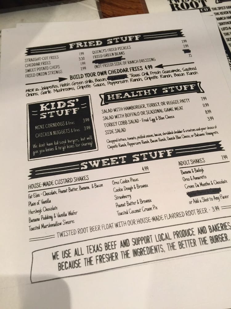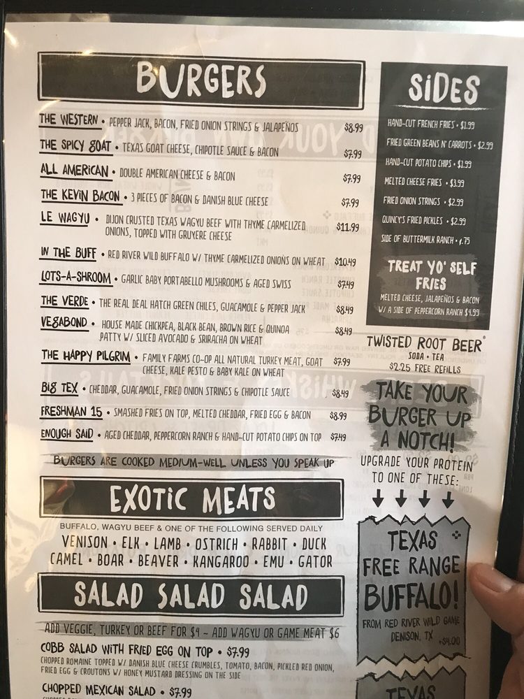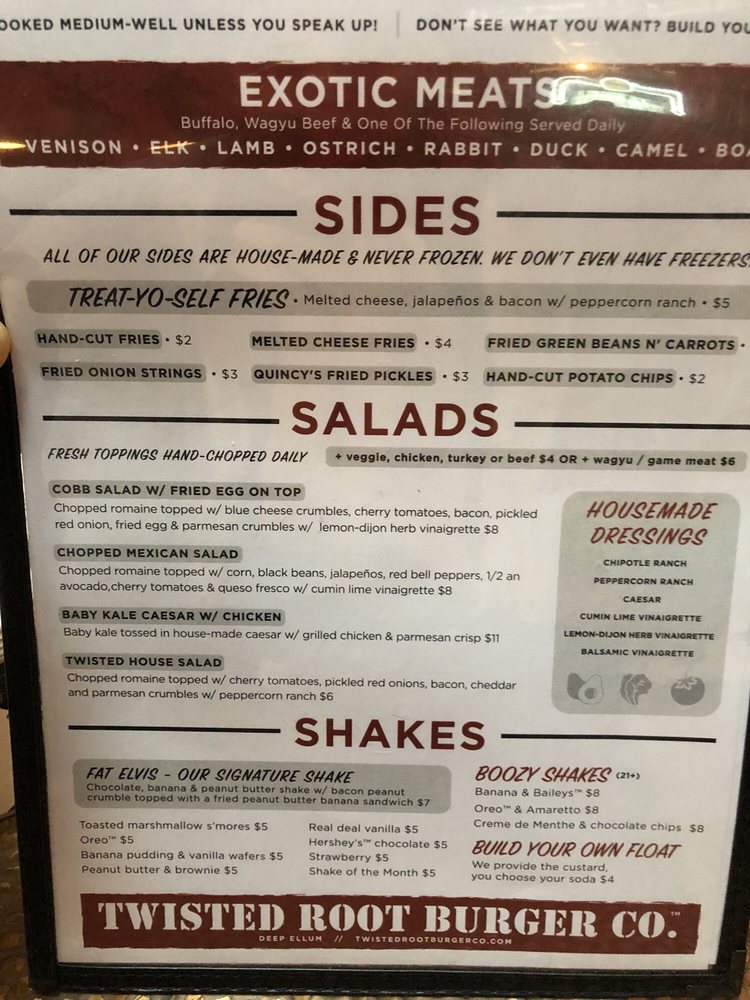 Introducing the menu at Twisted Root Burger, a renowned American burger joint located in Dallas, TX. With a vast array of options, including vegan and vegetarian choices, this casual yet classy spot offers a delightful dining experience. Customers rave about the juicy and flavorful burgers, accompanied by delicious sides like onion straws and fries with ranch. The unique pickles bar allows for customization, and the large rustic space is perfect for groups. The Southern Western vibe adds a fun touch to the experience, making it a must-visit spot for lunch or dinner. Don't miss out on their giant margaritas and the entertaining character calls when your food is ready. Twisted Root Burger truly stands out for its diverse menu, excellent service, and inviting atmosphere.